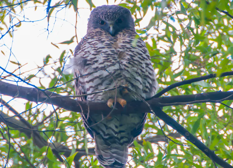 Or we are in the forest, up beyond the river flats, where Day goes at night, alone or with others, in search of the “whoo-hoo” of the Powerful Owl, the local “monarch”, which preys on ringtail possums hiding in the darkness, performing “the mid-air ballet of the canopies of midnight”.